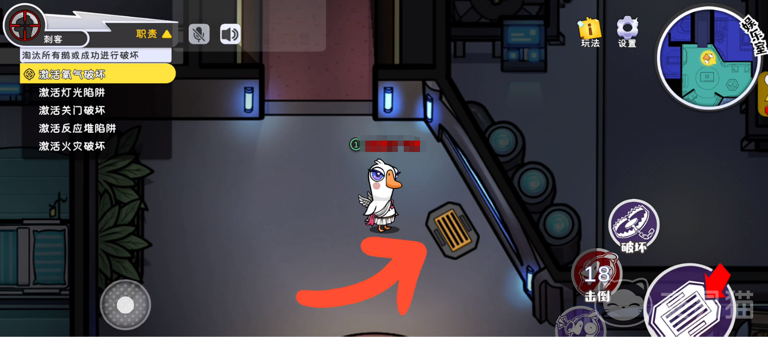 鸭子可以利用通风管道在地图上穿行,点击箭头移动到从通风管道出来时要留意周围有没有人发现,不然被其他人开启会议淘汰出去就失败了。只要大家悄悄悄悄靠近大鹅,并点击按钮就可以击败他们。另外刺客也可以通过完成某些特定的任务,就能解锁搞破坏活动。