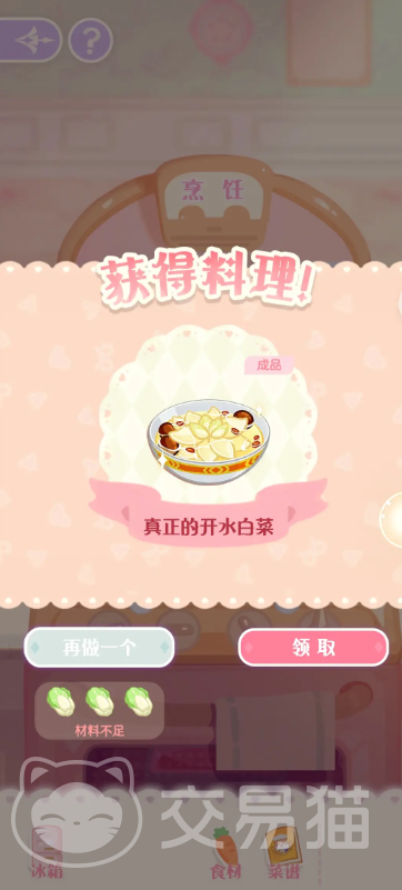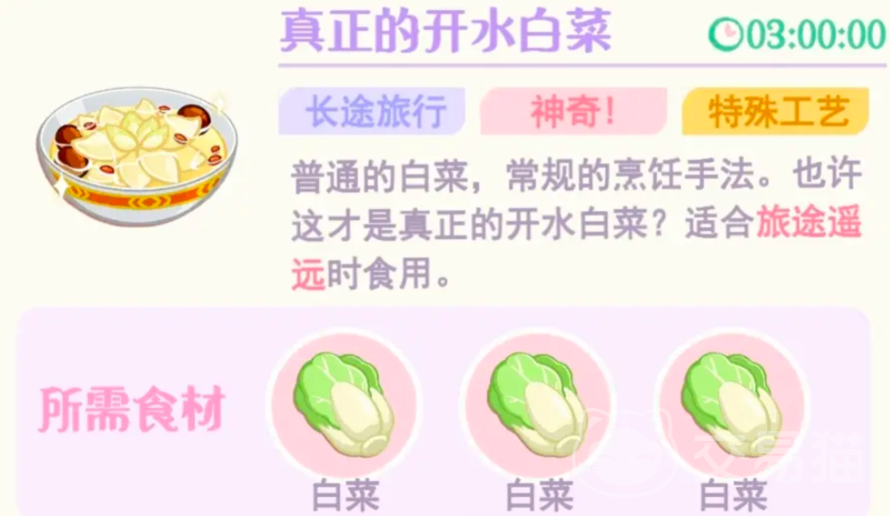不过在这之前,大家先需要解锁对应的菜谱。想要解锁菜谱的话,可以在商店中购买开水白菜的制作菜谱;如果没有足够多的金币,那也可以做任务或者进行探索,都有一定的概率获取菜谱。只不过没有的话,要是自己也想要继续进行长途旅行,那就可以用其他菜谱进行代替。