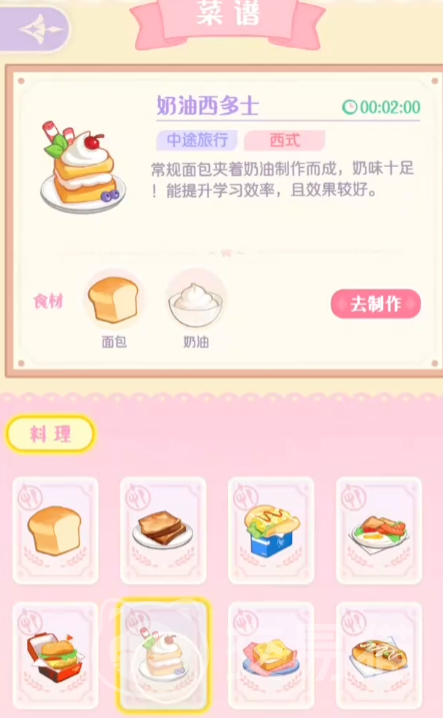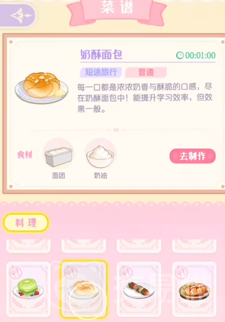 之后大家要是想制作短途旅行的食品,那就同样可以使用奶油,再搭配一份面团的话,就可以制作出一份奶酥面包。这种面包具备着浓厚的奶香味以及酥脆的口感,而且可以提升角色的学习效率,让他更快的掌握一门技能。