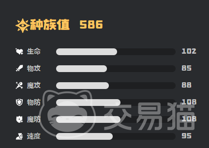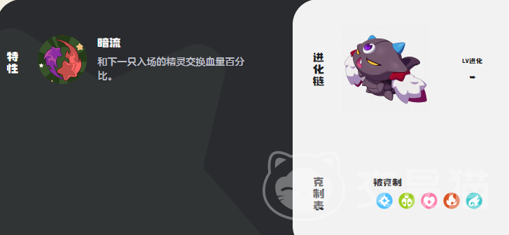 从种族数值来看,总共是586,有95速度,108物防,还有85物理攻击以及102生命,可以和下一只入场的精灵直接交换,血量百分比。进化链相对而言还是比较简单的,可以直接从瑰眼仔开始,逐步进化。在属性克制方面会被火系,还有光系克制,但是能有效抵抗草系,还有龙系。