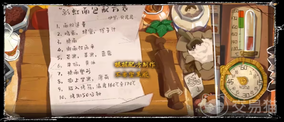 在诺瓦街收集蜡烛、获取铲子后帮助湖边老爷爷钓鱼,随后在诺瓦街拆解音盒获取手柄,用于衣绳升降。线索汇聚后,最终前往贝尼尼住宅,以墙上的“794年”为密码打开盒子,获取烟斗并交予贝尼尼先生。他感动于你的坚持,赠与你梦寐以求的彩虹面包配方。
