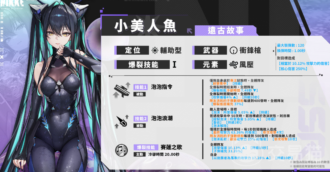 整体而言,小美人鱼赛莲是值得抽取的,但是不值得进行星级的增加,由于赛莲的一命效果,能够辅助增强泡泡指令,所以在pve内,可以尽快的补充弹药,同时帮助队友进行推图。
