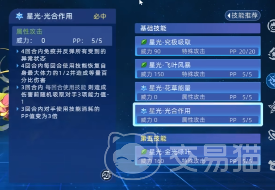 星光・金光绿叶技能效果极为强大,它能消除对手回合类效果,消除成功之后,下回合受到的伤害可以转化为自身体力,大大提升了自身的生存能力,同时它还能降低对手所有技能PP值一点,并恢复自身所有技能PP值一点,打乱对手的技能释放节奏,保证自身技能的持续输出,星光・飞叶风暴技能可解除自身能力下降状态,解除成功则恢复自身所有体力,这在面对一些喜欢弱化对手的精灵时尤为关键,能够瞬间恢复自身状态,重新掌握战场主动权,星光・究极吸取技能可以吸取对手能力提升状态,吸取成功则为自身附加300点护盾,这在面对强化型精灵时能及时打断其强化节奏,并为自身提供防护。