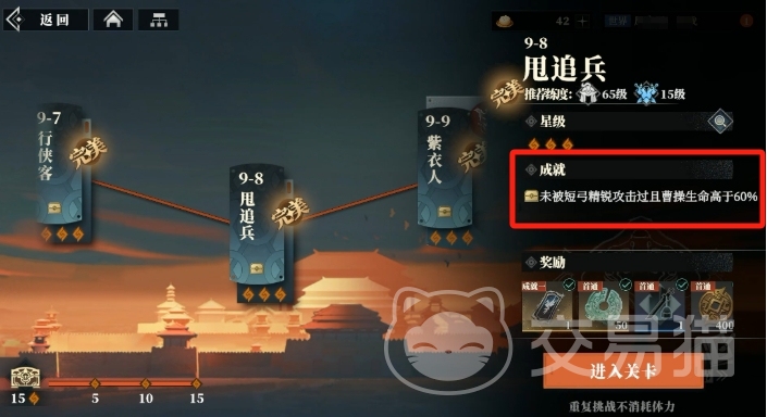 大家在每一个主线关卡里都能看到相应的成就要求,而且这里达成三星过关成就的条件跟通关的三个要求是一样的,也就是说只有把这三个要求都圆满完成了,才能够顺利达成三星过关的成就,就拿9-8这个关卡来举例吧,这个关卡它涉及到应对长弓和短弓敌人的特殊机制,这就要求玩家在战斗过程中,必须通过合理运用技能,像控制类技能或者爆发类技能等,去快速清理掉那些追兵。