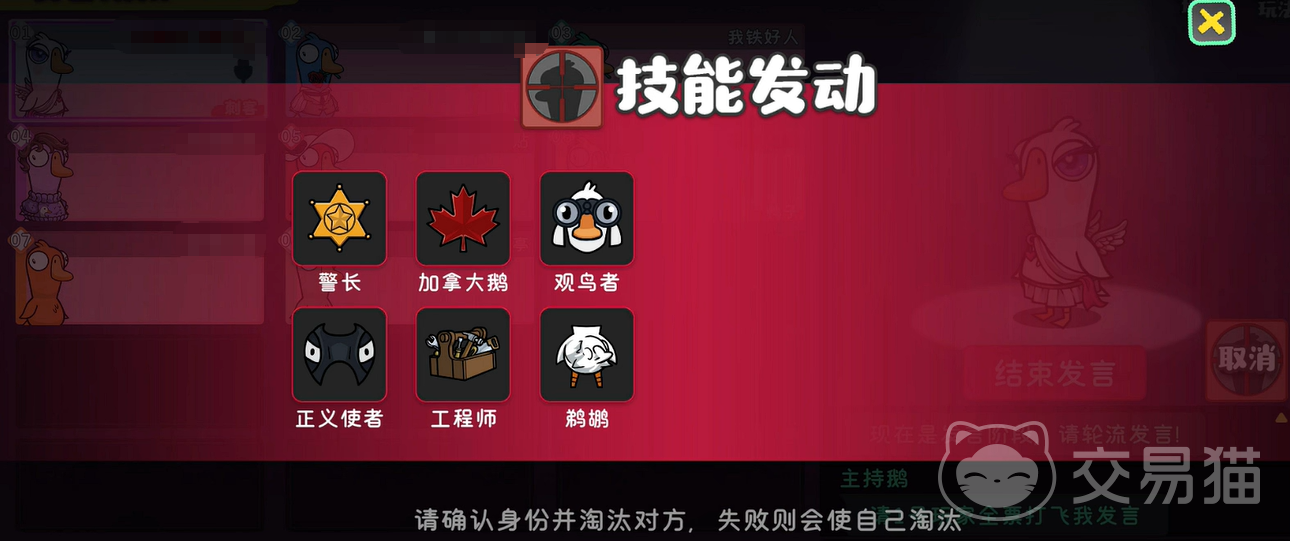 警长的技能机制为主动击杀:警长可以击杀任何玩家(包括鸭子、中立或鹅阵营)。击杀鸭子或中立角色:无惩罚,直接消灭目标,要是一不小心误杀鹅(好人):警长会立即死亡,导致好人阵营损失两人。所以大家在选择击杀目标时一定要小心,不能让自己的阵营减员。