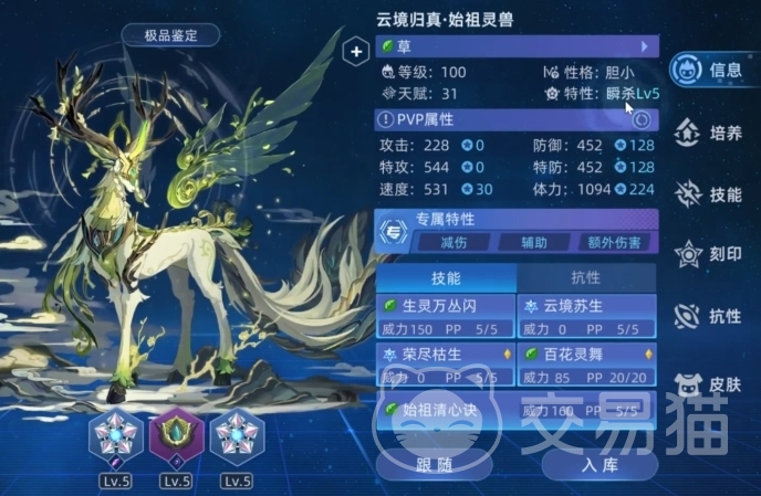 百花灵舞技能具备多重强大效果,它可以吸取对手能力提升状态,一旦吸取成功,自身便能免疫下1次受到的异常状态,这在面对强化型且擅长施加异常状态的对手时,有着极大的优势,既能打断对手的强化节奏,又能为自身提供一层保护,荣尽枯生技能使用后,5回合内免疫并反弹所有受到的异常状态,这让云境归真・始祖灵兽在面对擅长异常干扰的精灵时,不仅自身不会陷入异常,还能将异常反弹给对手,打乱对方节奏,复苏之光技能使用技能可以恢复体力值,为云境归真・始祖灵兽提供了一定的续航能力,在战斗中能够持续保持自身血量健康,虽然每回合恢复的体力值不算多,但在持久战中,点滴的恢复也可能成为决定胜负的关键因素。