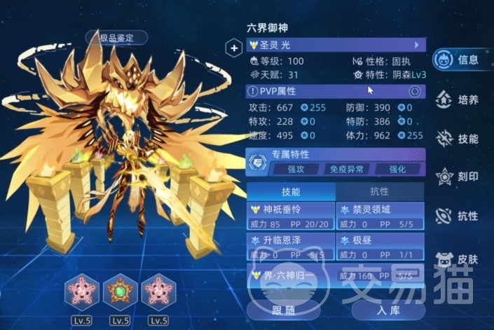 神祇垂怜技能堪称六界御神的先手利器,它能够吸取对手的能力提升状态,一旦吸取成功,自身下回合必定致命一击,极大地提升了后续输出能力,升临恩泽技能使用后,回合内免疫并反弹所有受到的异常状态,这使得六界御神在面对擅长施加异常状态干扰的精灵时,能够从容应对,自身不会陷入异常,还能将异常反弹给对手,打乱对方节奏,禁灵领域技能有必中效果,当自身处于能力提升状态时,强化效果翻倍,在战斗中能够迅速提升自身实力,超界审判也是必中技能,能够反转自身能力下降状态,反转成功则使对手随机技能PP归零,在面对削弱自身的对手时,既能恢复自身状态,又能干扰对手技能释放。