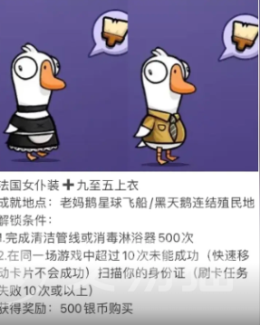 法国女仆装和九至五上衣套装:这一个服装解锁的方法还是比较多的,例如玩家可以选择在老妈鹅星球飞船这边解锁。所需要做的就是完成清洁管线,一般的情况下都需要500次,相对而言,就会比较考验玩家的耐心。