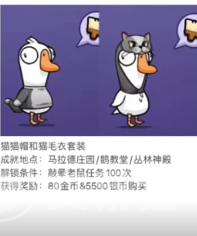 猫猫帽和猫毛衣套装:这一个服装还是比较有趣味性的,解锁的条件很特别,玩家只要完成100次的敲晕老鼠任务,就可以获得100次的成就,那么在此时就能够获得这一个非常可爱的皮肤套装。