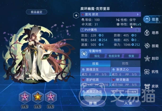 腐坏幽魔・克劳里菲种族值总和达740,各属性分布为战斗提供了多样可能,体力168,赋予她良好的生存根基,能承受较多伤害,在战斗中维持一定的在场时间,攻击70在其技能体系中并非输出核心,但部分技能效果会关联攻击数值,特攻140配合混沌・邪灵系特攻技能,是主要输出手段之一,可对敌方造成可观伤害,防御112与特防112,在面对物攻和特攻型对手时,都能提供一定抗性,保障自身在战斗中的稳定性,速度138处于中等偏上水平,能在多数对战场景中争取到较为合适的出手顺序,更好地发挥技能效果。