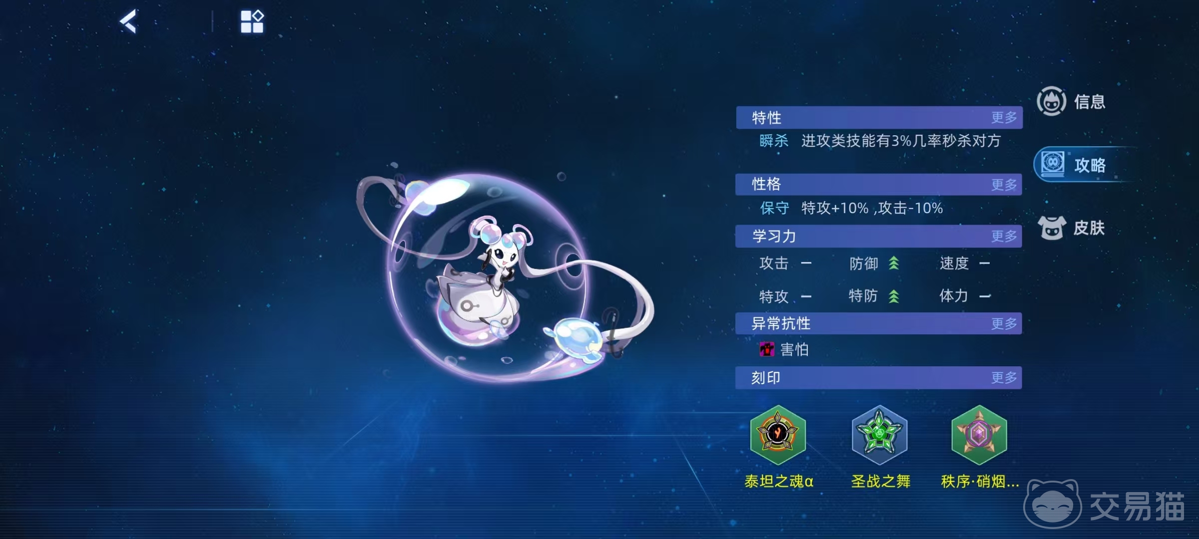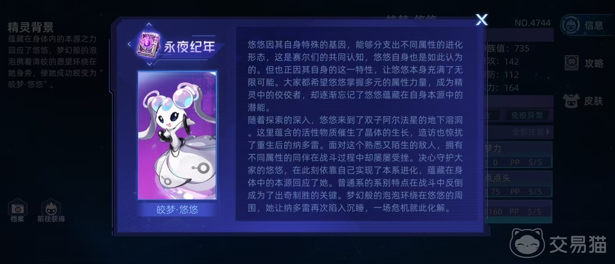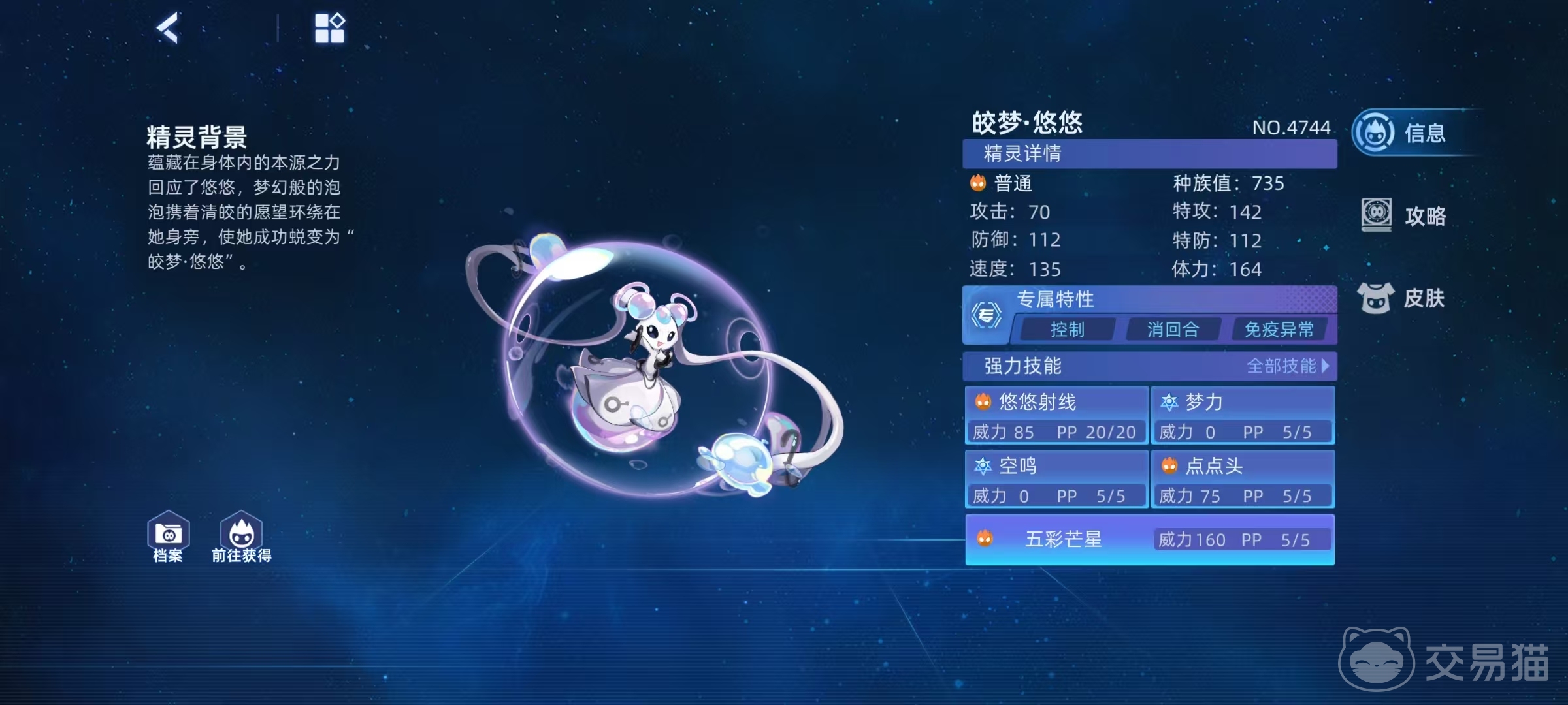 皎梦悠悠的专属特性为控制、消回合和免疫异常效果,自身登场的当回合战斗阶段结束时,触发一次入梦,之后每间隔三回合战斗阶段结束时,都额外进行一次入梦,50%几率令对手睡眠。自身的入梦间隔为零回合,自身技能不受pp值限制,且无视攻击免疫效果。属性方面也比较出色,体力164,特攻142,速度135,防御和特防都是112,这都是比较不错的属性。