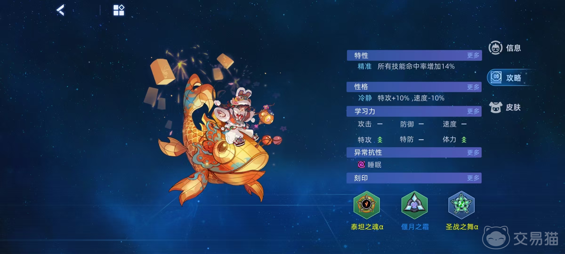 在属性方面,花灯仙子的体力169,特攻139,速度136,这三项属性都是非常不错的,防御和特防都是113,在生存力方面也有保证,属性方面绝对值得重点培养。在特性方面,当自身受到技能伤害高于400时,有几率令对手睡眠,如果没有触发,则恢复自身400点体力。受到伤害值低于400时,下回合对手属性技能无效无效,成功后恢复己方在场精灵以损失体力值的80%,这样对敌方就是很好的控制和干扰。