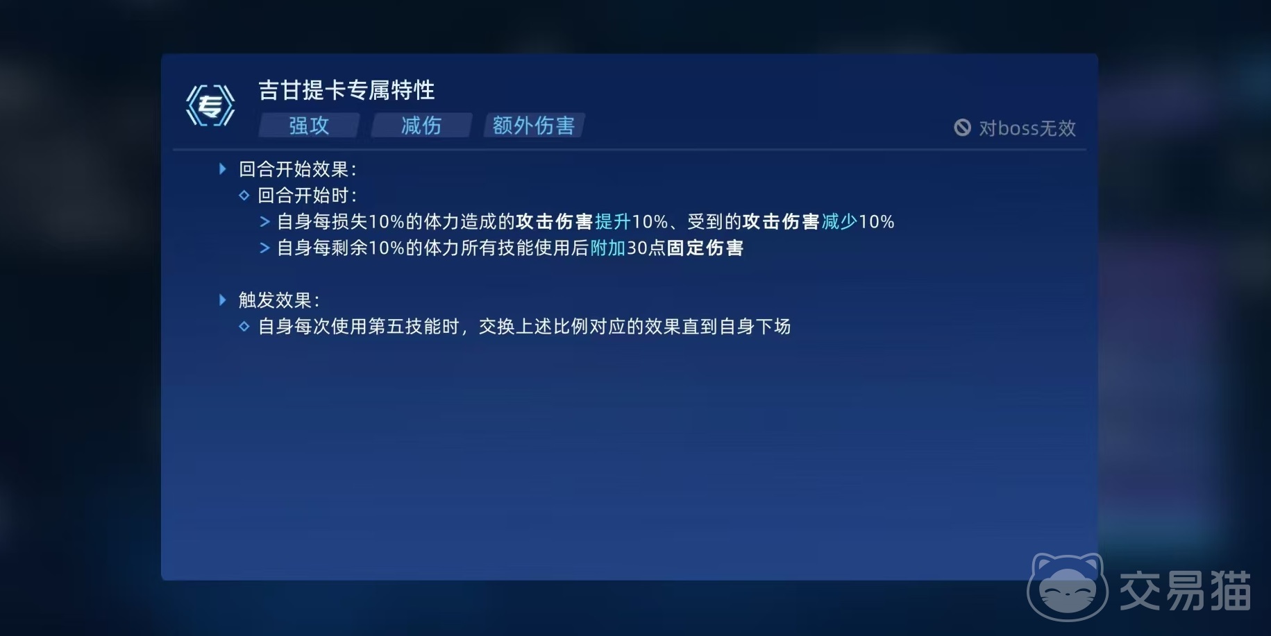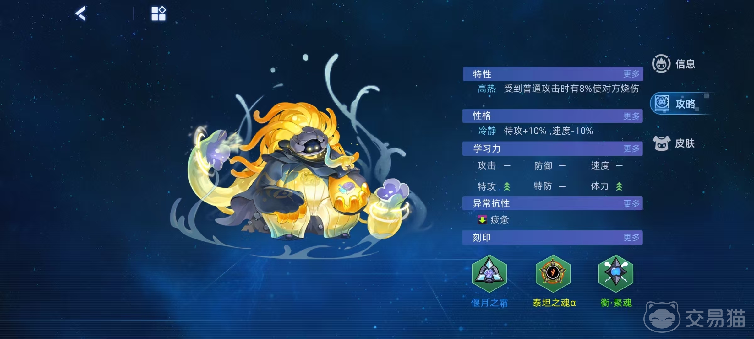 在种族属性方面,体力171非常优秀,特攻133,速度130,这两项也属于较强势的一类,防御和特防都是117,非常均衡。专属特性为强攻、减伤和额外伤害,主要特点就是自身每损失10%的体力,造成的攻击伤害就能提升10%,受到的攻击伤害减少10%。自身每剩余10%体力,所有技能使用后附加30点固定伤害。无论是在满体力还是在空血的时候,都有不错的加成。