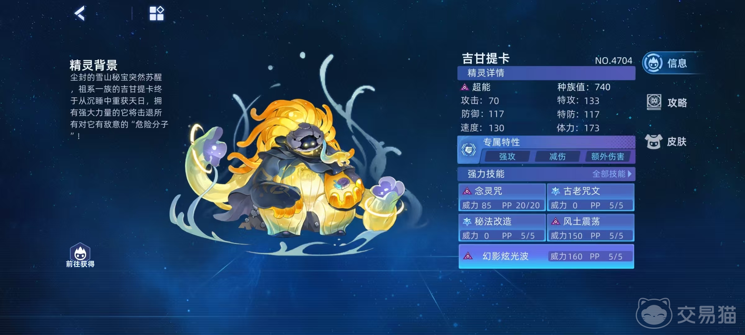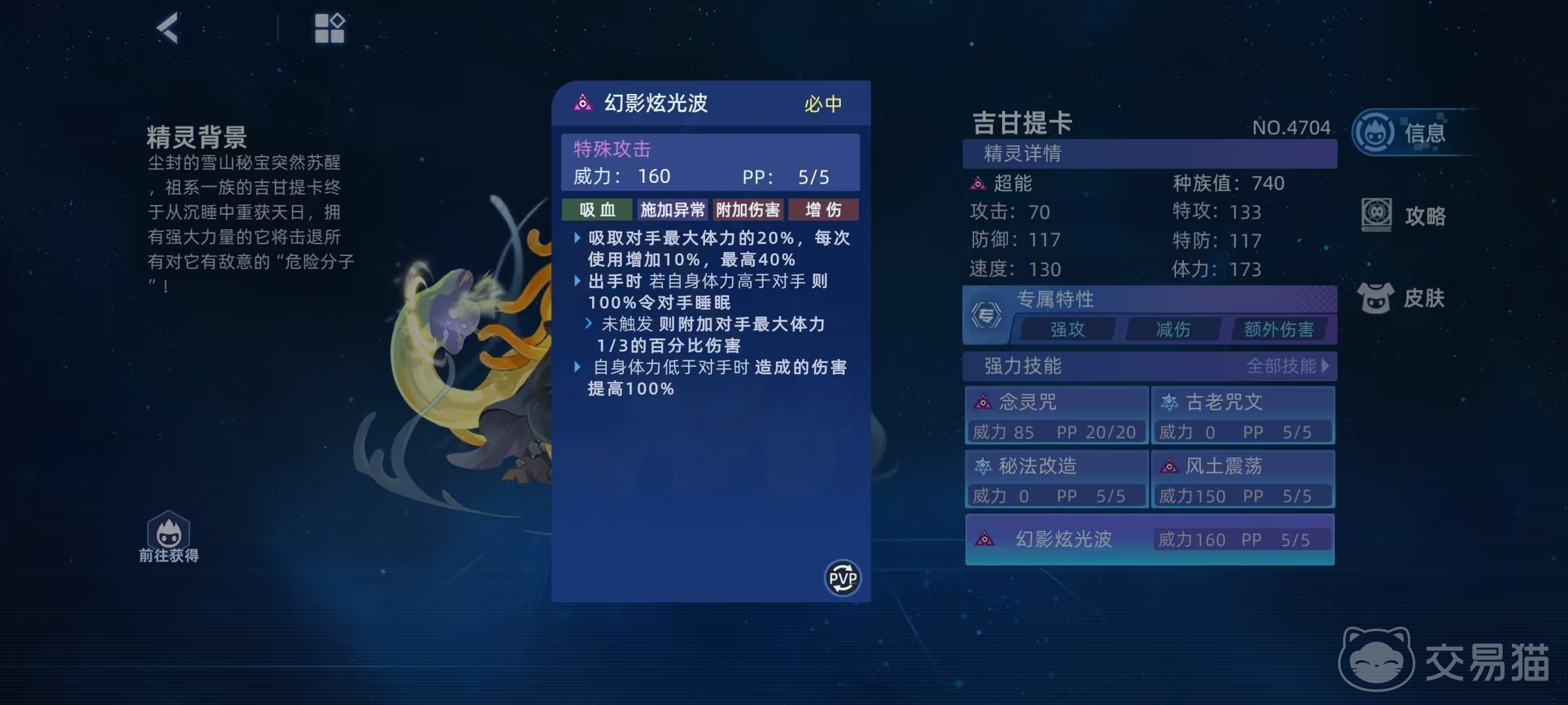 主要技能包括念灵咒、古老咒文、秘法改造、风土震荡以及幻影炫光波等。幻影炫光波威力巨大,可吸取对手体力,出手时若体力高于对手,有几率使对手睡眠。风土震荡属于特殊攻击类型,可对敌方产生消除回合、附加伤害、减pp等一系列效果,对于自身还有全属性加成状态。念灵咒能将对手的能力提升状态吸取过来,吸取成功后还能附加额外护盾,以及将自身能力下降状态解除等。另外两个技能,古老咒文具有免疫异常,减pp,增伤免伤等效果。秘法改造主要是用于全属性强化,还有恢复和吸血能力,提高生存。