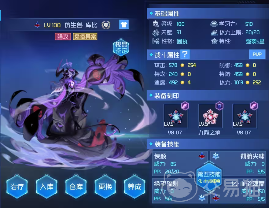 其技能“悚颜”可视为核心组件之一。先制+3的优先级让其无论在临门一脚还是防御转攻中都具备极高的实战价值。该技能不仅能解除自身的异常状态,还能将这些状态附加给敌方目标,并进一步吸取并反转对手的能力增益,构建出一套状态反制的闭环机制。搭配“失真复影”的技能复制或条件触发的体力恢复与全属性削弱效果,库比形成了一种极为独特的反应型成长体系。