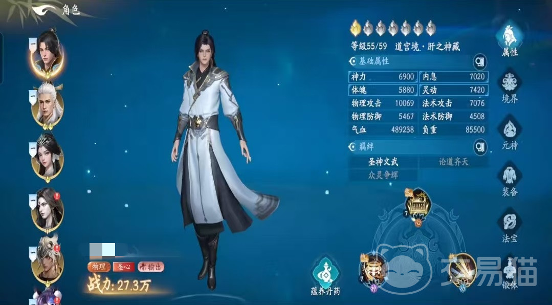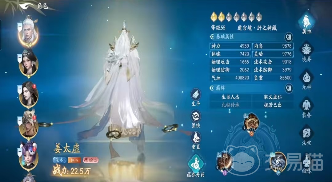首先是为主角凑出了圣神文武这一套羁绊,圣神文武的效果是和两名神心道友一起上阵,主角护体增加8%。还有一个羁绊论道齐天同样也能激活,论道齐天的效果是与两名道心道友一起上阵,主角物攻增加6%,法攻增加6%,这样攻防两端都达到了很强的境界。接下来是姜太虚,姜太虚也激活了生当人杰羁绊,在拥有增益时,无视10%法术防御属性。