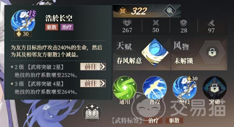 蔡文姬她有着团队需要的治愈效果,蔡文姬的治疗技能能够为指定的友方目标带来高达240%的生命治疗,虽然蔡文姬的群体回血能力相较之下稍显薄弱,不过这也并不影响她在辅助位置上的重要地位,毕竟三星解锁驱散技能后,她在整个辅助体系里面依旧是好用得很,她的治疗技能可不只是单纯地给队友回个血这么简单哦,还具备强大的驱散功效,能够为该目标及其相邻的友方各驱散一个减益效果。