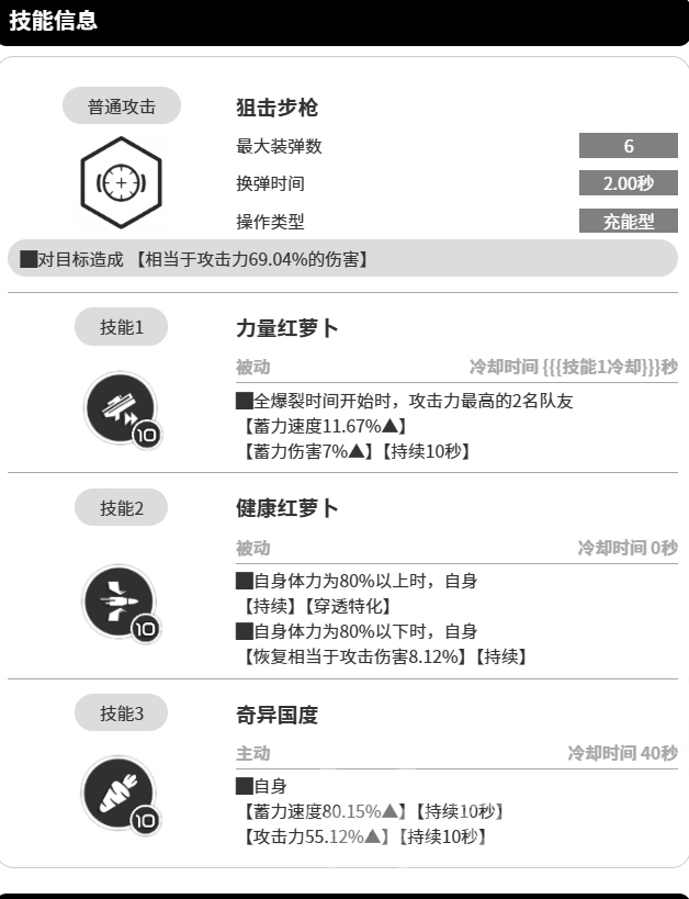 爱丽丝在成长过程中,对于一些属性有着独特的需求,其中弹匣容量要乘以3,让她在激烈的战斗中无需频繁地更换弹匣,能够持续地输出火力,始终保持对敌人的压力,蓄能速率要乘以2,使她能够更快地积攒能量,而在扩展属性方面,暴击增幅要乘以3,这让她的每一次攻击有更大的几率打出暴击伤害,基础攻击也要乘以3,这是对她基础实力的一次全面提升。