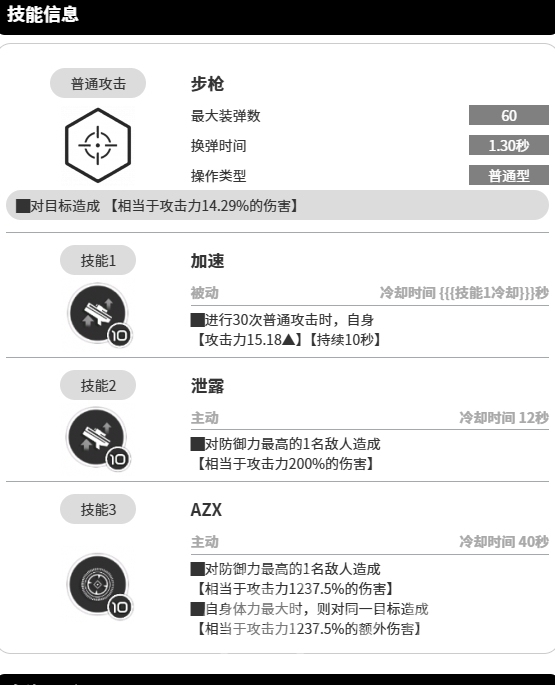 而且换弹时间仅仅只要1.30秒就能完成,这样短暂的换弹时间,在战斗中能够让她在弹药耗尽后迅速完成补充,时刻保持强大的战斗力,同时其还是普通型的操作,简单易上手,让玩家们能够轻松驾驭,虽然单次攻击造成的伤害只是相当于自身攻击力14.29%的伤害,看起来似乎并不起眼,可是千万不要小瞧这每一次的攻击,架不住武器的子弹数量多啊,当60颗子弹倾泻而出时,综合来算普攻技能造成的总伤害也是比较高的了,能够对敌人形成一股强大的火力压制。