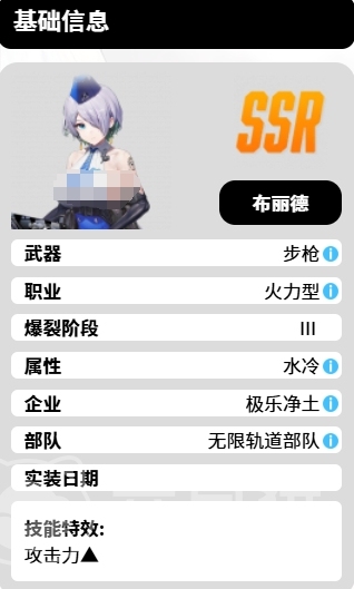 布丽德在游戏中是一位拥有水冷属性的火力型步枪手,所以有专属的战斗风格,要说布丽德这个人物最大的特效点究竟是什么,那肯定就是她超强的攻击力,其攻击力之高是很难有角色可以达到的,她的战斗属性更是极为出色,不仅拥有一个极为广泛的攻击范围,而且暴击率和暴击伤害也处于较高的水平,这使得她在战斗中一旦触发暴击,便能给予敌人超强的打击。