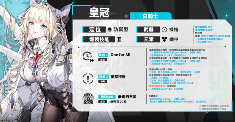 皇冠她属于铁甲阵营,皇冠主要使用的武器是机枪,机枪在她手中就像被赋予了生命一般,她的普通技能就是使用这把机枪向敌人发起攻击,机枪里最多可以装填300个子弹,这充足的弹药量就像是她无尽的战斗力源泉,让她在战斗中能够持续输出,不给敌人丝毫喘息的机会,不过每次子弹消耗完毕之后,更换弹夹需要消耗2.5秒的时间,除了常规的普通技能之外,皇冠还有三个独特而强大的技能,其中两个是被动技能,一个是主动技能。