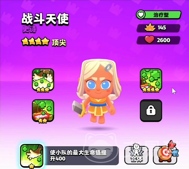 2技能小队的生命加成在升级后提高到600,打开宝箱之后治疗效果大幅度提升,打开宝箱能给小队成员回复700生命值,合体后效果提高到1750。二她的被动影响,会在上面出现天使光环,从而给战斗天使提升血量上限;