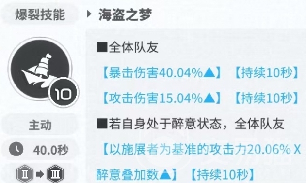 后期还可以通过这样不断地积累,能够削弱敌方的防御,而当自身体力在70%以下时,她又能化身团队的输出助推器,为自身与除自身以外攻击力最高的2名队友提升暴击伤害30.1%,这个效果是持续生效的,还有一个同样是非常实用的被动技能海盗的眼光,也无冷却时间,在战斗开始时,它就可以为自身与除自身以外攻击力最高的2名队友提升暴击率13.92%,持续30秒,这一技能在战斗前期就为团队输出核心提供了强力增益,使得他们在开局阶段就能够打出高额伤害。
