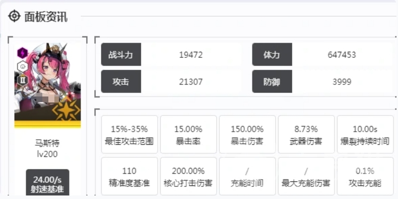 8.73%武器伤害、24.00/s射速、110精准度,这些属性相互配合,保证了她攻击的稳定性,让她在战斗中的每一发子弹都能精准地命中目标,10.00s爆裂时长、200.00%核心打击伤害,又让她在关键时刻可以爆发输出,给敌人造成可观的伤害,而0.1%攻击充能则助力她的续航能力,让她在长时间的战斗中能够持续保持战斗力,从这些数值上面看,总体而言她的属性与支援定位还是比较匹配的,为团队的支援工作提供了坚实的保障。