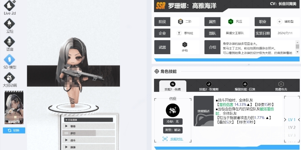 罗珊娜高雅海洋凭借着SSR的稀有度,在众多角色中脱颖而出,她的属性为风压,职业定位是辅助型,由泰特拉企业精心打造,隶属于黑道女王部队,这样的背景设定让大家都觉得她很神秘,她所使用的武器是步枪,而她的身份更是颇为特别,身为赫多尼亚老大,受马士丁之托前往地面拍摄杂志照片,身上穿着泳装,在限定角色当中也因为这个外观带来了很高的人气。