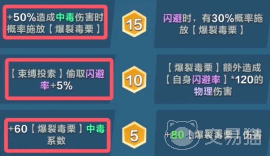 而到了10级,则有束缚投索偷取闪避率+5%以及爆裂毒栗额外造成自身闪避率*120的物理伤害等选项,这些天赋进一步强化了小松鼠的闪避与中毒联动效果,在搭配卡牌方面,小松鼠可以依赖闪避和中毒的叠加效果,在中期开始发力,并通过后期的15级天赋和大招卡实现高爆发和生存能力的兼备,蓝卡方面可以选择灵敏强化、无形疗愈、无形之盾、疗愈魔法、奥法之盾、奥法剧毒等卡牌来增强自身的闪避、治疗和抗性。