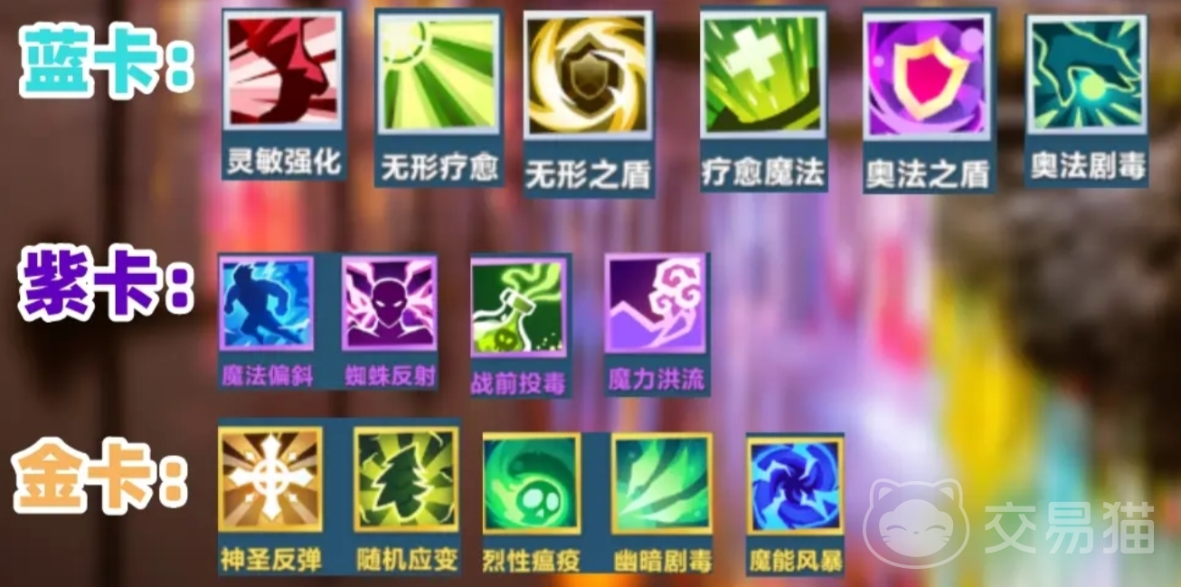 紫卡则可以考虑魔法偏斜、蜘蛛反射、战前投毒、魔力洪流等,这些卡牌能够进一步提升小松鼠的闪避几率、中毒效果以及魔法抗性,金卡方面,神圣反弹、随机应变、烈性瘟疫、幽暗剧毒、魔能风暴等都是不错的选择,它们能够在关键时刻为小松鼠提供支持,在游戏过程中小松鼠需要优先提升闪避和中毒的等级,其中闪避等级至少需要达到40级,而中毒则在10级以后补上紫卡即可。