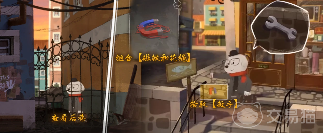 捡起老人丢掉的磁铁,打开背包把红绳和磁铁组合在一起,回到里布街,对着下水道使用能从里面获取到扳手,拿着扳手到柳树街,把该道具给准备修理灯泡的修理工,然后请他帮助我们打开后巷的门。