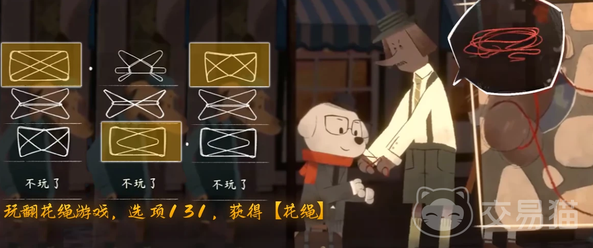 首先我们点击面包店门口带绿帽的先生,他会邀请我们玩翻花绳,注意游玩的时候注意,第一局我们选择选项一,第二局我们选择选项三,第三局选择选项一,这样选择就能得到胜利,并且他会直接把道具花绳送我们。