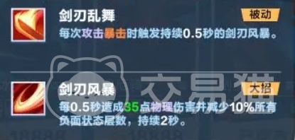 剑圣的被动技能为剑刃乱舞,每当攻击产生暴击时,便会触发持续0.5秒的剑刃风暴,在这段时间内能够对周围敌人造成可观的伤害,其大招剑刃风暴更是威力惊人,每 0.5秒可造成35点物理伤害,并且能够减少10%所有负面状态层数,持续2秒,在实战思路上,叠攻速是玩好剑圣的关键所在。通过高频次的攻击触发暴击,进而激活被动技能,形成一个连贯的输出循环。