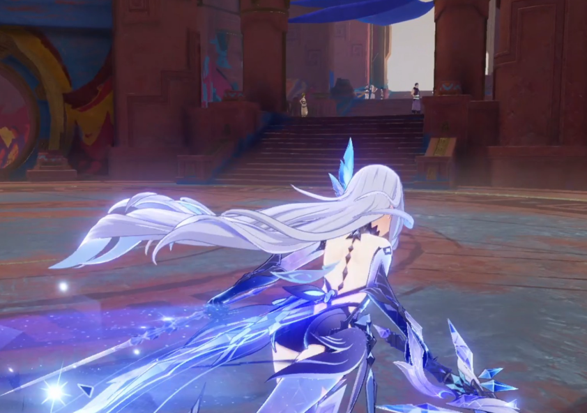 队伍中附近的角色对敌人触发冻结、超导、冰元素扩散时,将在敌人旁创造一枚虚境,场上最多可存在3枚虚境裂隙,每汲取一枚虚境裂隙,还会让自身得到8点蛇之狡谋,她的固有天赋二会在附近有水、冰元素队友,并造成水、冰伤时,让自身得到一层20秒的死河渡断,该效果会让自身在七相一闪模式下的伤害更高,她的固有天赋二会在队友所有角色都是水和冰时,让角色的元素战技等级提升1级。