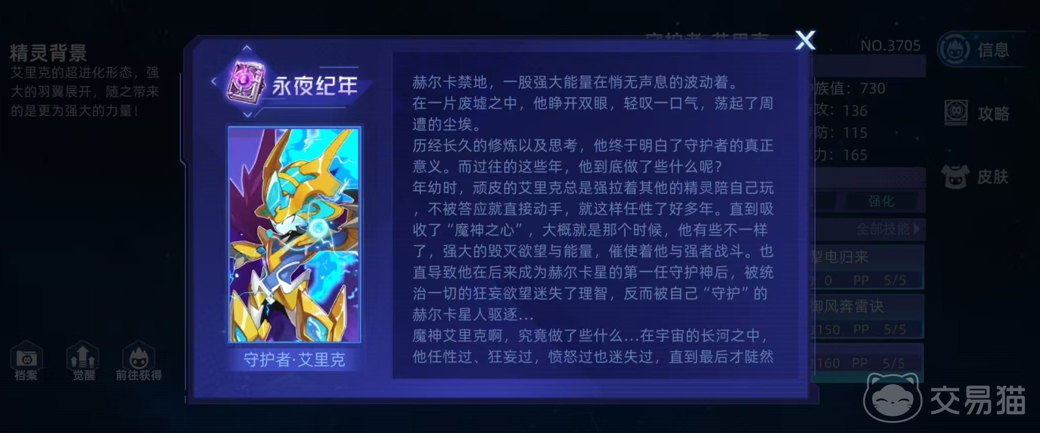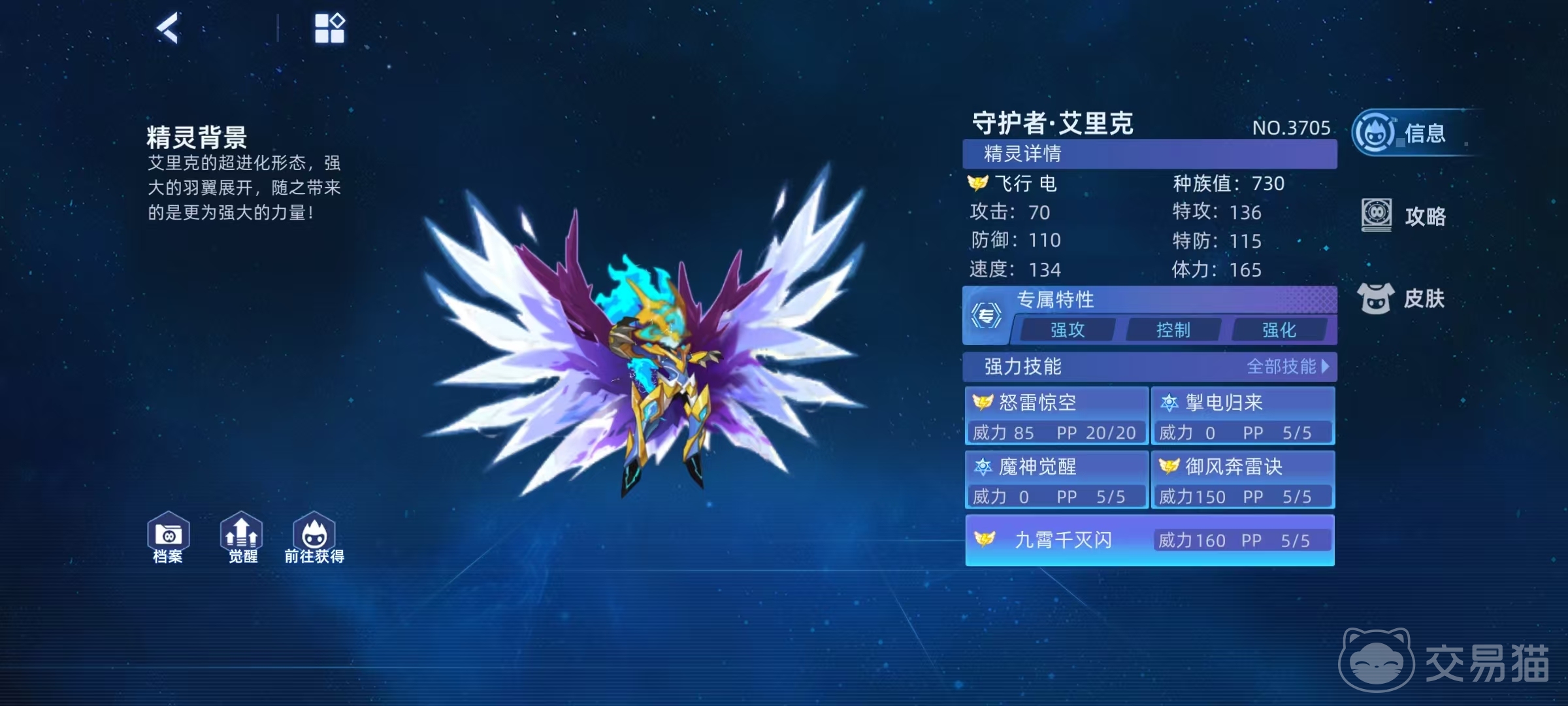 守护者艾里克在种族值方面,体力较有优势,特攻和速度也属于比较高的数值,攻击最低,所以走的就是特攻路线。专属特性为强攻、控制和强化,先出手能附加自身速度50%的固定伤害,后出手时下回合所有技能先制加2。在自身使用技能时可随机获得一种效果,分别是自身全属性加1,对手全属性减1,自身附加护盾,100%打出致命一击等。