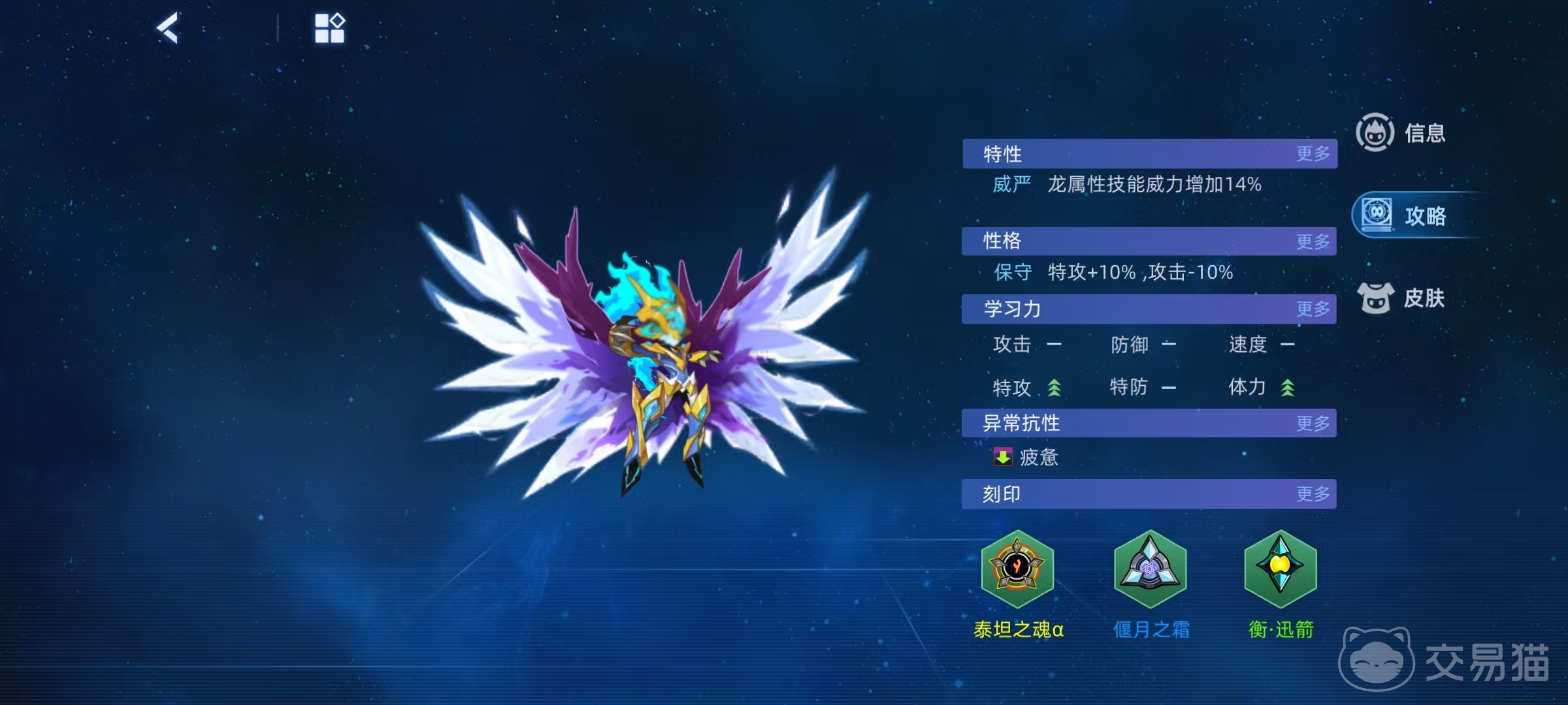 通过技能可以看出,在各个效果上还是非常丰富的,无论是输出还是其他效果都比较出色,尤其是在自身具有速度优势时,更是能够打出很可观的伤害。但是在生存能力方面还有待加强,虽然具有一些防御和干扰类型的技能效果,但如果面对高爆发或者是控制能力强的精灵时,生存能力依然有限,所以比较容易被击败。培养的时候,特性选择威严,龙属性技能威力提升14%,性格选择保守,提升特攻减少攻击,学习力推荐提升特攻和体力,异常抗性选择免疫疲惫。