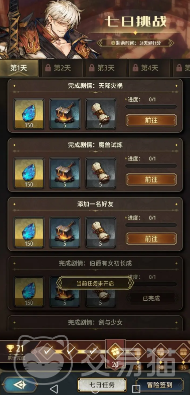 然后七日挑战需要大家在一个月的时间内完成,第一天的话就可以解锁第一天的任务。这些任务其实都是很基础的新手任务,例如完成前面的剧情章节,即可解锁并拥有对应的奖励。接着也可以添加好友,完成之后就能获得经验值以及其他材料奖励。