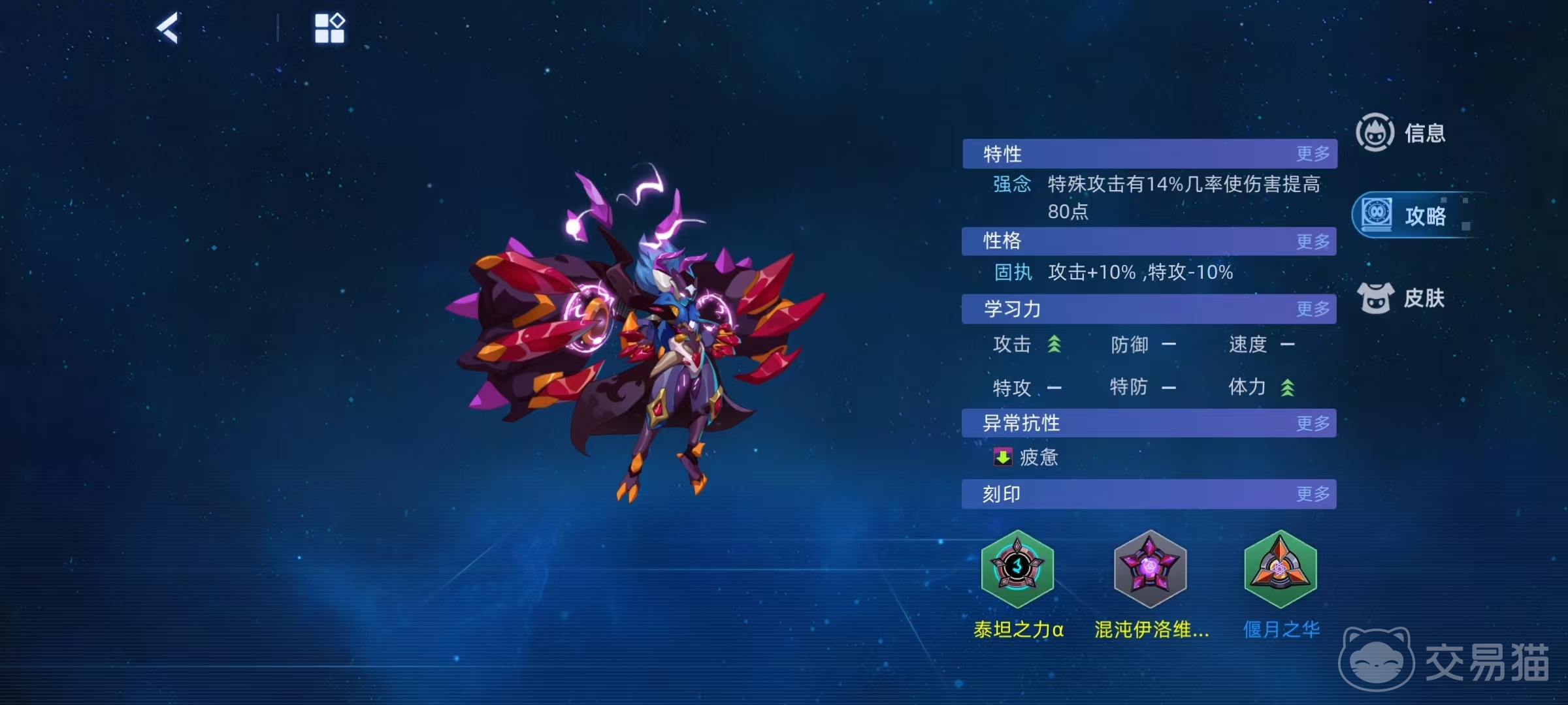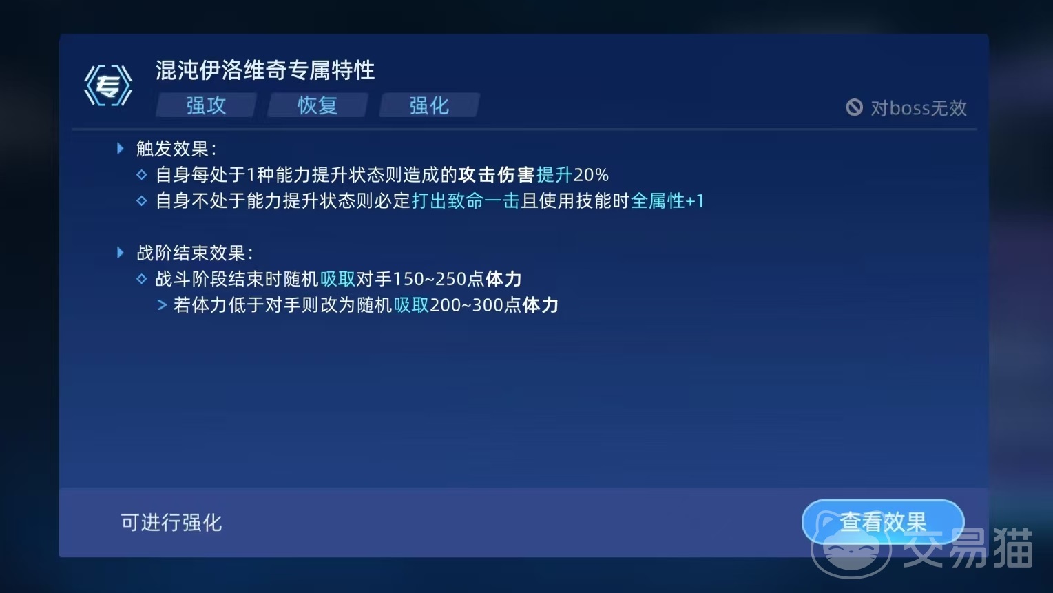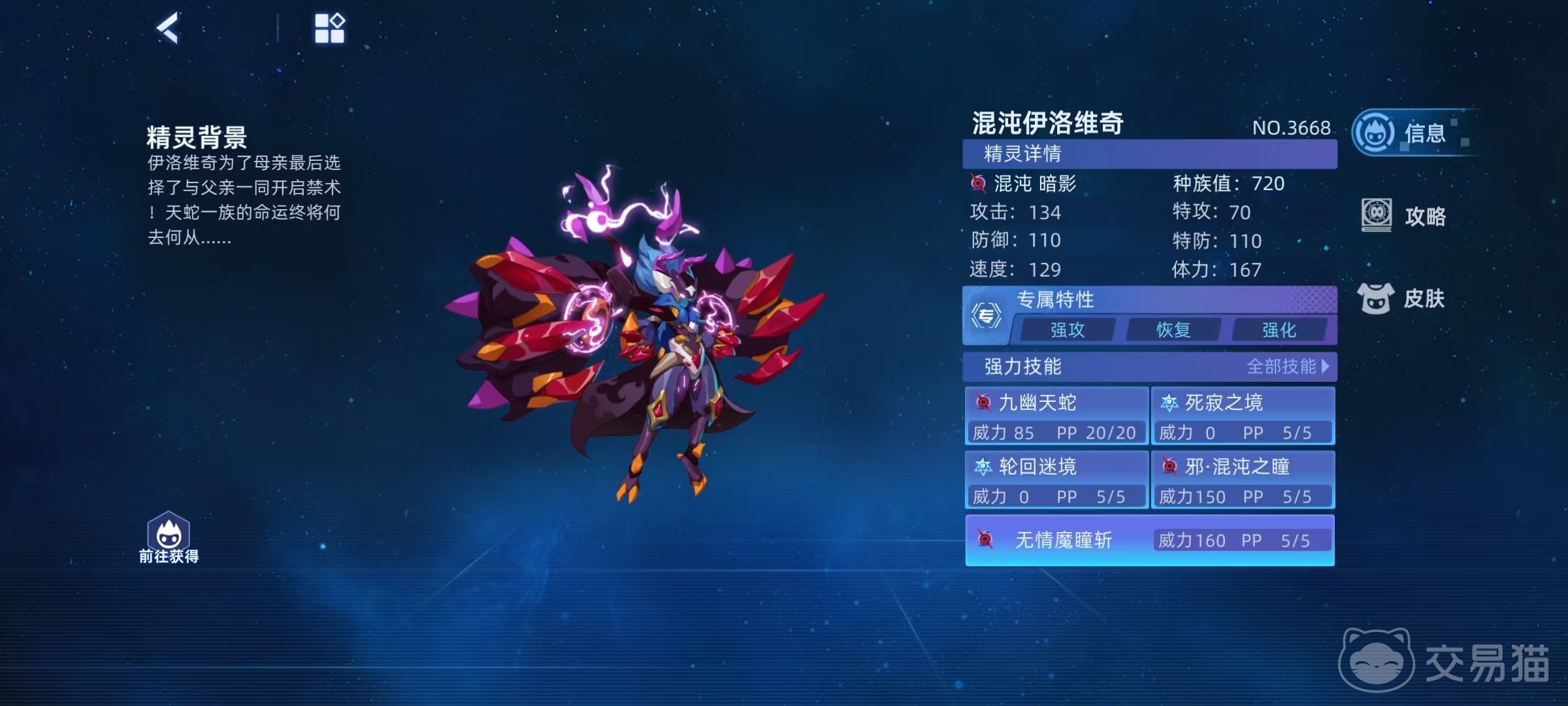 混沌伊洛维奇属于混沌暗影系列的精灵,在种族值方面,体力167,攻击134,速度129,防御和特防都是110,速度方面并不算特别占优势,体力还算较为优秀。在自身特性方面,每处于一种能力提升状态,造成的攻击伤害就能增加20%,当自身不处于能力提升状态时,必定打出致命一击,使用技能时全属性加1。
