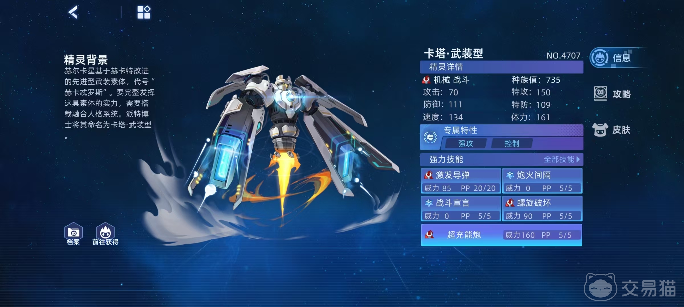 卡塔武装型在属性方面,体力最为出色达到了161,特攻150也是非常强势的一个属性,速度134,防御111,特防109,各个方面可以说都有优势。专属特性是在每次登场后,首次攻击技能造成攻击伤害提升,首次属性技能使用后,有几率令对手瘫痪。自身击败对手时,重置登场效果。登场之后的首次攻击技能和属性,技能在技能选择方面推荐激发导弹炮火间和战斗宣言和螺旋破坏这4个。