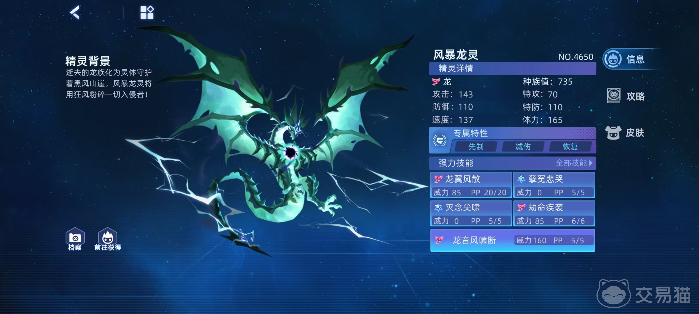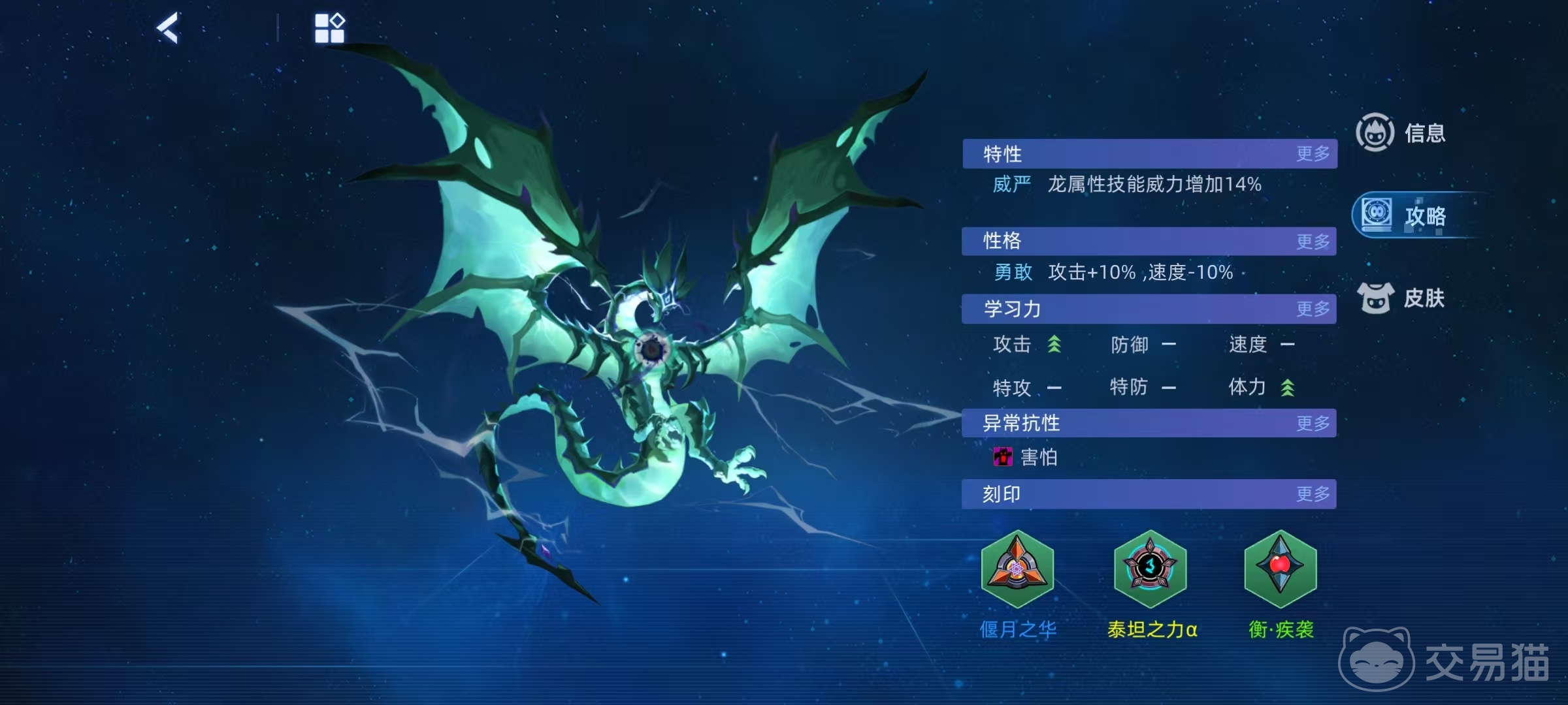 在得到之后,接下来就是进行培养,为了发挥出这个精灵的优势,特性方面推荐选择威严,使龙属性技能威力增加14%。性格选择勇敢,提升10%攻击,降低10%速度,学习力先将攻击拉满再加体力。接下来是在技能选择方面,小编推荐的四个技能分别是龙翼风散、孽冤悲哭、灭念尖啸和劫命疾袭。在这些技能中,龙翼风散和劫命疾袭是属于输出类型的技能,龙翼风散可以吸取对手强化状态,并随机让对手的两项技能pp值归零,劫命疾袭可附加固定伤害,还有伤害增加的效果。