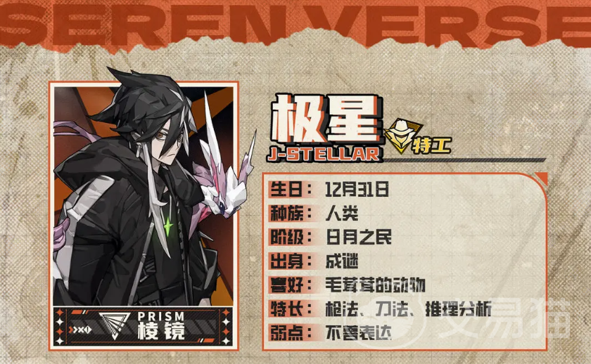 极星是棱镜阵营的英雄,具备很高的责任感,拥有很优秀的战斗天赋,在短短几年迅速的成长为优秀的小队长,寡言少语的他擅长分析,具有领袖的气质。作为综合性的近战职业,具备一定的输出能力和机动性,还拥有专属的远程攻击手段。