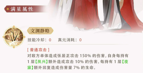 张居正的普通攻击“文渊静略”,初看之下只是较为常规的单体伤害技能,基础倍率为150%,但其特殊之处在于与他独有的双状态系统密切联动:每持有一层【夙兴】,附加10%额外伤害。而每层【夜寐】,可恢复伤害量7%的生命。这种“边打边养”的机制,使得张居正在输出的同时具备一定的自我续航能力,在中长线战斗中极具优势。
