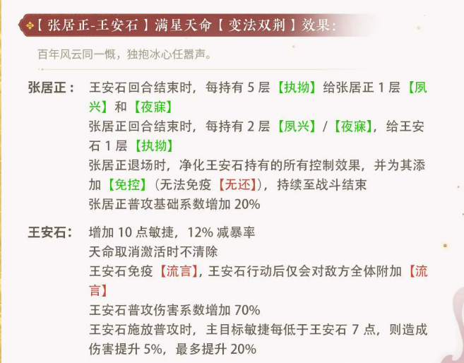 与王安石的搭配则更倾向于持续强化与状态循环。两者通过状态互换实现层数增长,张居正能在王安石行动结束后获得【夙兴】与【夜寐】,而王安石则能因张居正的状态获得【执拗】。同时张居正退场时为王安石提供免控效果,确保其后期输出与干扰能力。此组合适合中后期运营,通过层层铺垫建立优势。
