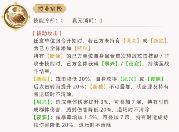 他的被动技能机制则更为核心和复杂。战斗开始或任何单位的回合开始时,若己方未持有【谋众】或【断独】,张居正便会为全体施加【断独】。这是一个带有负面效果的预备状态,降低攻击20%,但当角色在回合内首次使用攻击或非攻击技能时,【断独】就会转化为对应的正面状态——【夙兴】或【夜寐】。