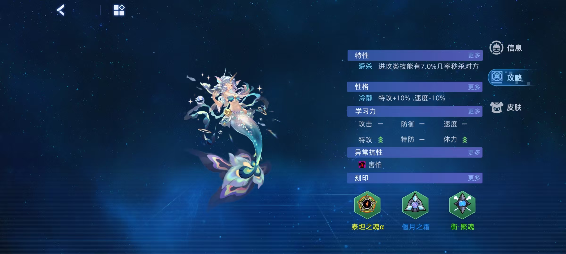 波尼啵妮是属于水属性次元精灵,体力158,特攻136,速度134,防御和特防都是111,这几项属性都比较优秀。自身的专属特性效果是,对手使用攻击技能时,100%令对手冻伤,触发冻伤当前回合有机率闪避对手攻击,未触发冻伤,则吸取对手体力和获得护盾。在养成的过程中,性选择瞬杀,使进攻类技能有几率秒杀对方。性格选择冷静,增加10%特攻,降低10%速度。学习力优先堆特攻,然后是体力。