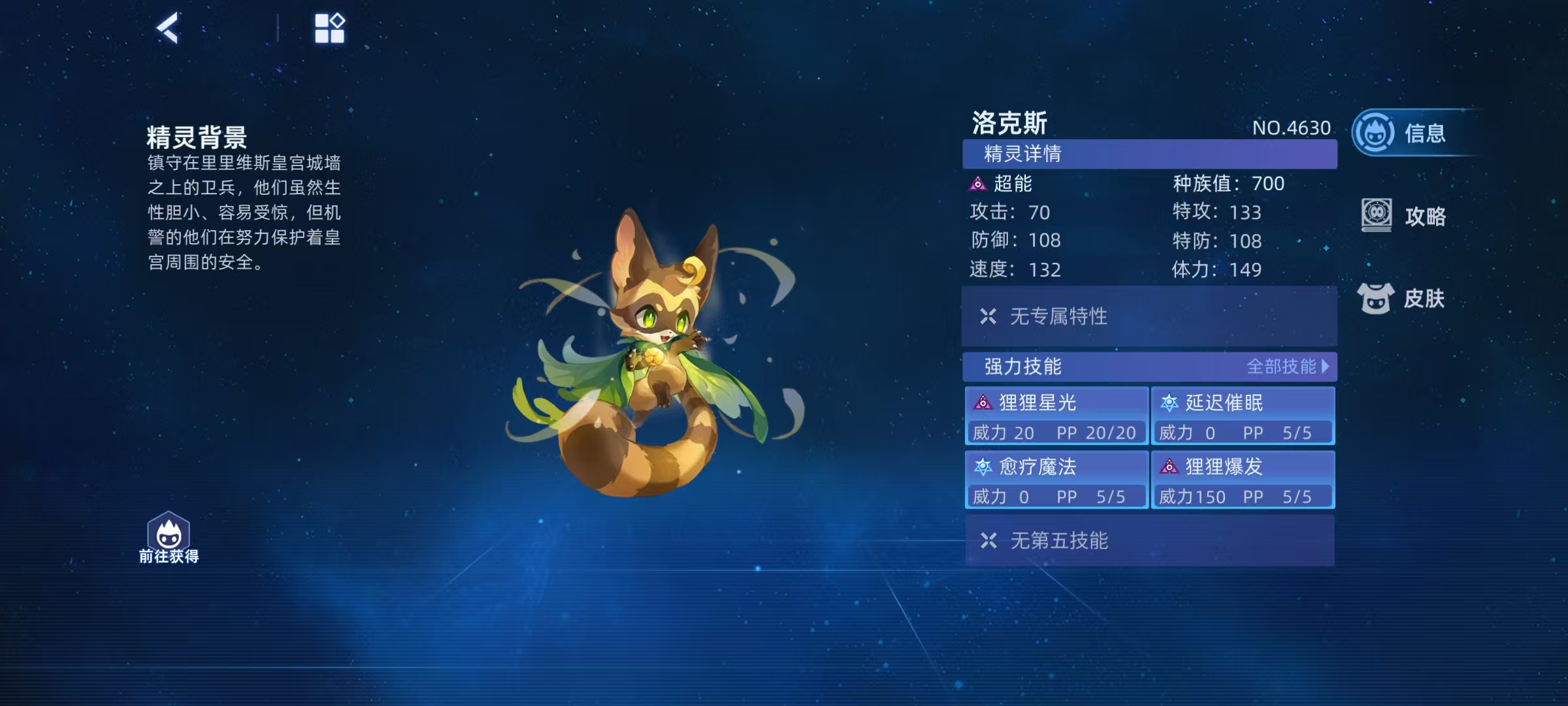 洛克斯是一名超能属性的精灵,它的体力是149,速度132,特攻133,防御108,特防108,比较中规中矩的属性,自身没有专属特性,培养的时候可以选择战意特性,使得战斗属性技能威力增加,性格推荐冷静,可提高特攻,降低速度,增强输出能力。学习力方面优先去加特攻,然后是体力。