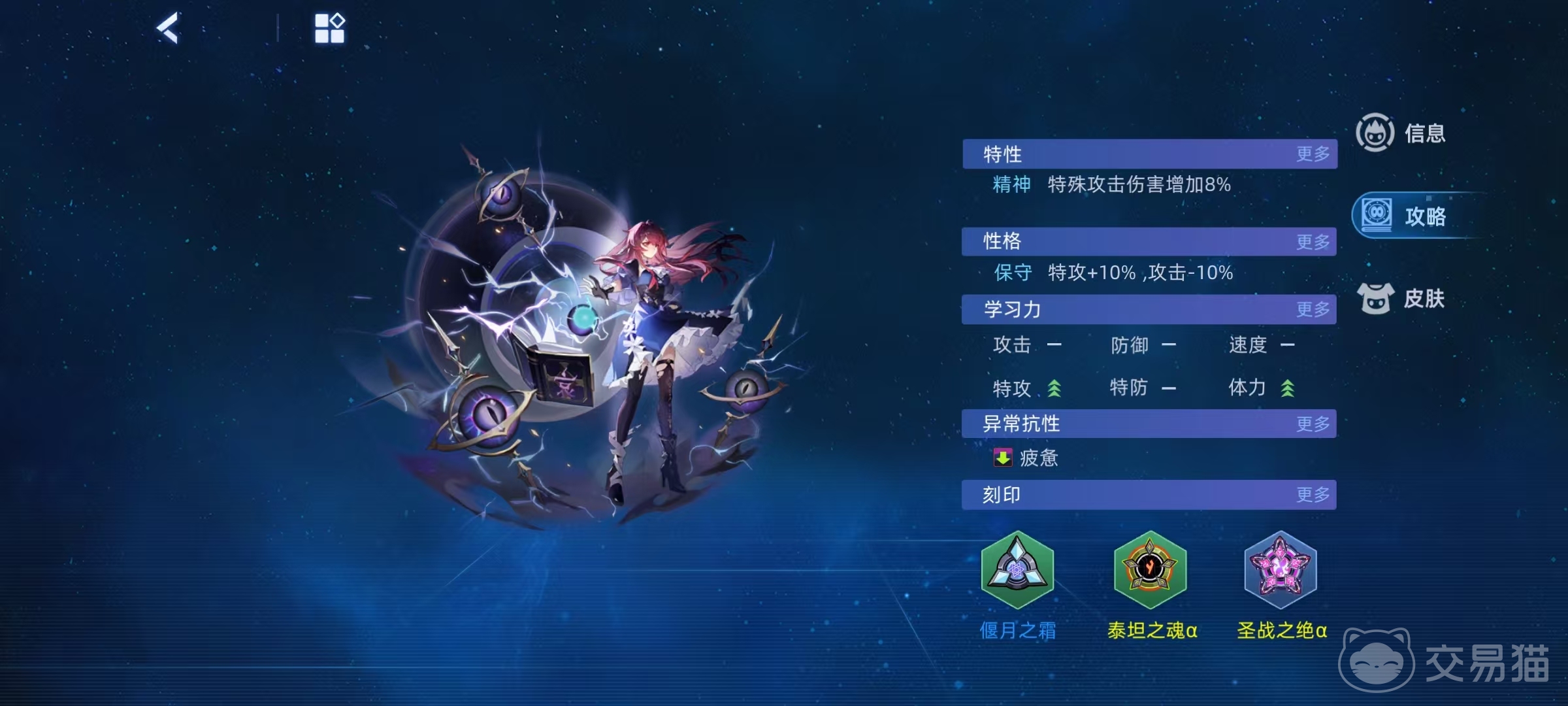 在培养的时候推荐选择精神特性,这样带来特殊攻击伤害提升8%的效果,进一步强化了特攻。性格选择保守,特攻加10%,攻击减10%,学习力也将特攻拉满,然后再加体力。技能搭配方面,当然也是以特殊攻击为主,两个伤害技能分别是逆世之瞳和一念去留断。逆世之瞳技能效果很丰富,具有消除回合,施加异常,效果无效,恢复体力以及附加伤害等一系列效果,另外先制加3,也使得此技能在战斗中非常好用。一念去留断威力非常大,自身还带有增伤和附加伤害,用于斩杀对手最为关键。
