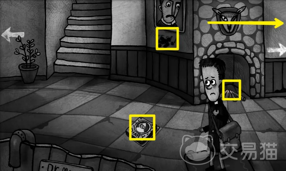 整个解谜的流程是这样的,先是要收集科学家的画像,玩家点击炉子生火,然后向右走,收集电视旁边的药丸,同时几下左侧的图案,这部分是初始阶段。