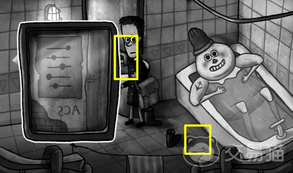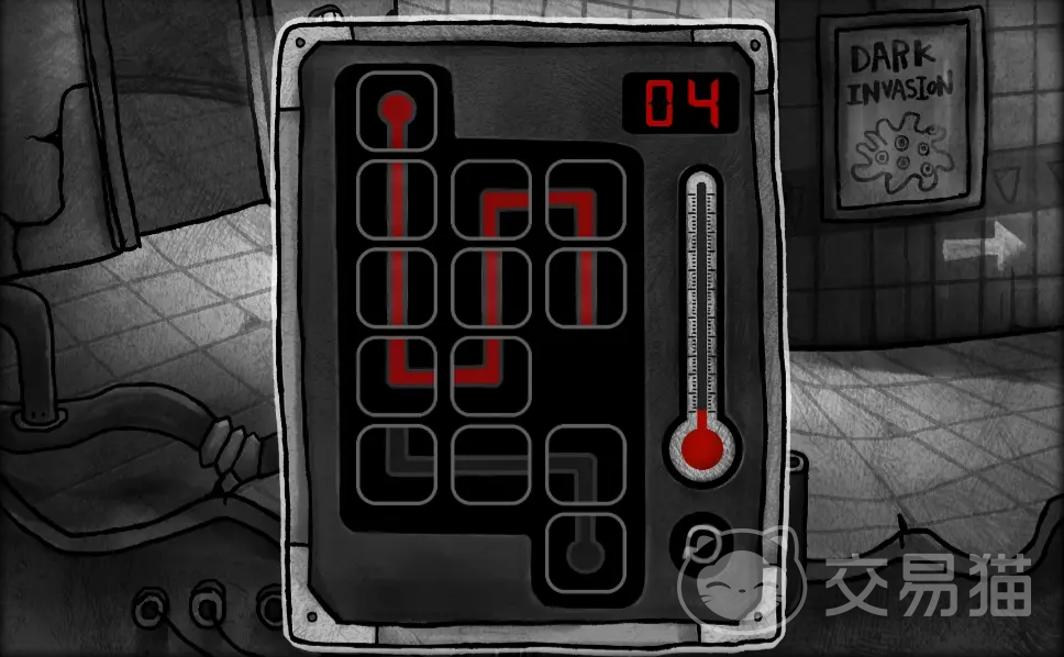 然后是拾取画面下方的水桶,然后与画面正下方的正方形的管道互动,这里就是关于怎么调节温度计的解谜了。其实并不是麻烦,先去点一下第二列第三排的红色方块,顺时针依次点,让温度计对应的管道线路呈现出“L”形,就可以从左下联通管道了。